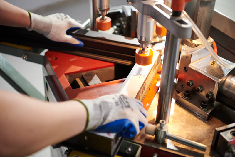 Bước 4: Đưa thanh nhôm vào – Ấn bàn đạp và giữ chặt thanh nhôm để máy tiến hành ép góc.