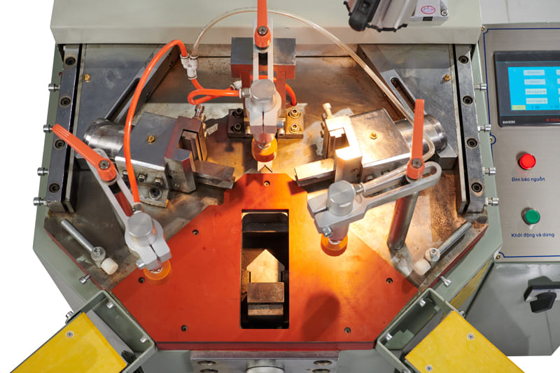 - Máy sử dụng 3 pittong kẹp giữ phôi và hệ thống ép thủy lực để liên kết góc của cửa nhôm chắc chắn và khít hơn.